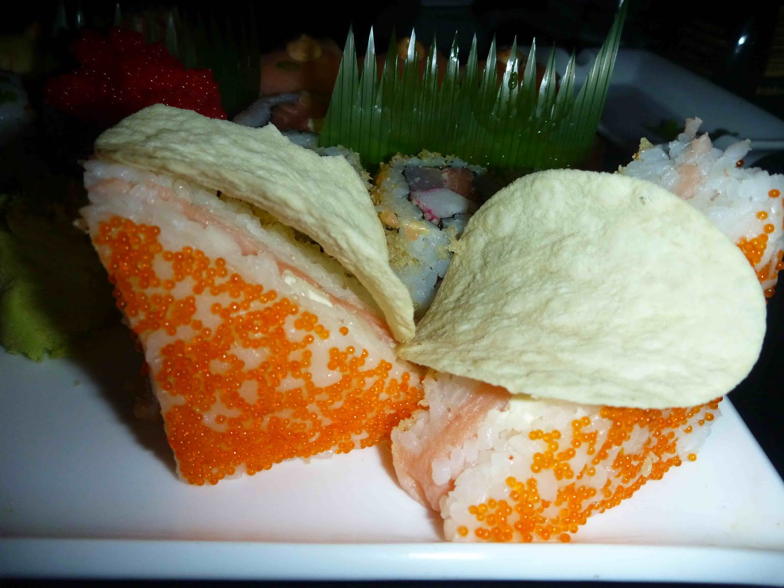 This is listed as a club sushi roll. Normally, chips don't fit into the fun category on the dinner table, tasty but not fun. On a sushi roll cut like a sandwich they achieve fun.
